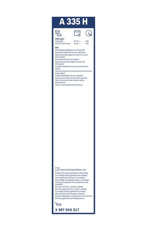 Den nye fastgøringsteknik med en Quick-Clip adapter, gør det let for dig selv at skifte dine Bosch A335H viskerblade: Det flade Aerotwin viskerblad visker hægtes fast på de almindelige viskerarme ved hjælp af adapteren. Udskiftning af viskerblade kan næsten ikke blive nemmere!