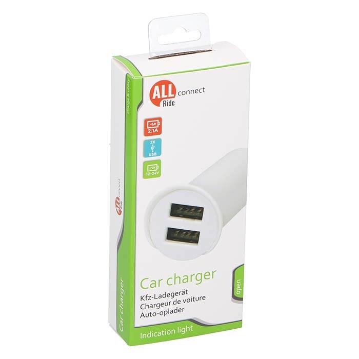 Universal USB stik med 2 udgange på max. 2.1A total.Den er uundværlig når man er flere i bilen, som skal have opladet telefonen, eller flere USB enheder samtidig. Indgangene har indikatorlys så det er nemt at se stikket, selvom det er mørkt i bilen.