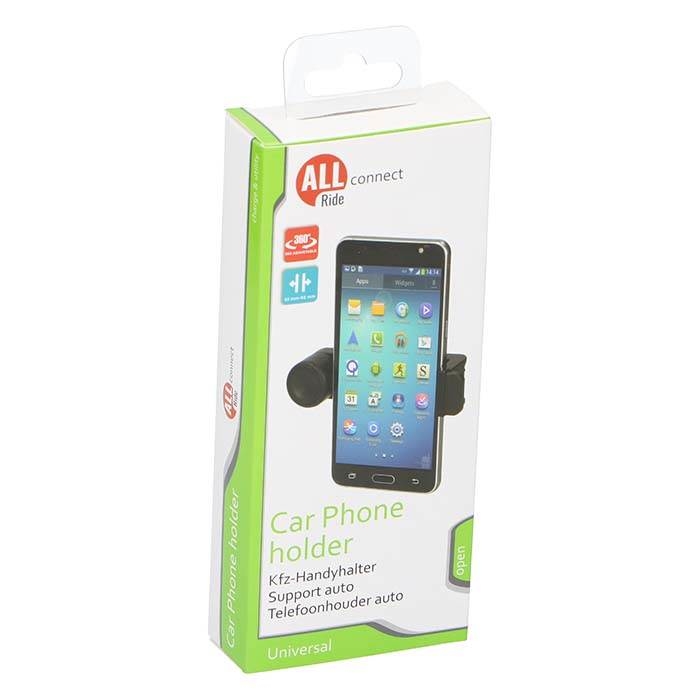 Monteres med clip på bilens luftdyse - simpel montering og stadig holdbarTelefonen sættes i holderen som kan justeres fra 52 - 92 mm som dækker de fleste telefoner