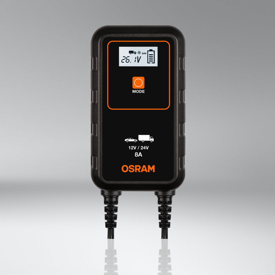 Den nye serie af avancerede smart opladere fra Osram kan anvendes til både opladning samt vedligehold af alle 12V og 24V autobatterier til de fleste typer motorcykler, biler SUV og van (Blysyre, Lithium og AGM)Batterycharge 908 er en 8A oplader beregnet til både 12V og 24V batterier.