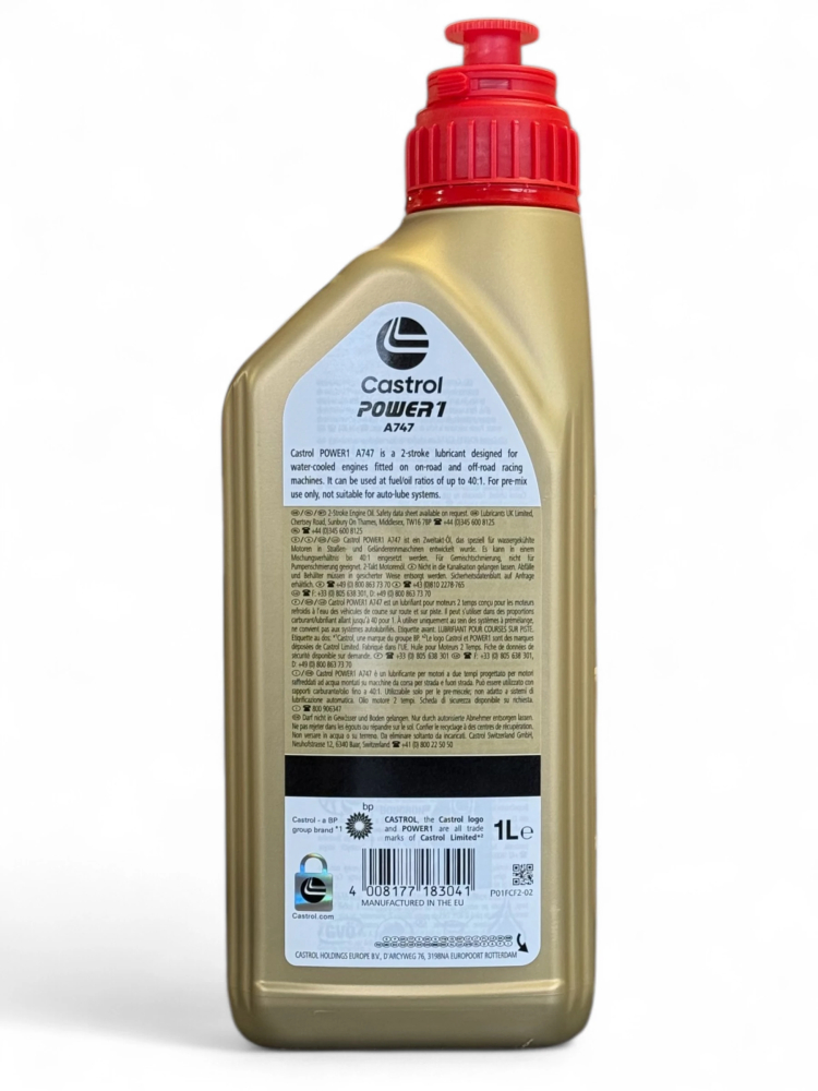 flercylinders, vandkølede totaktsmotorer i roadracingmotorcykler, hvor det er vigtigt at holde kontrol med mængden af aflejringer i forbrændingskammeret. Castrol power 1 A747 indeholder desuden specielle additiver, som modvirker blokering af gashåndtaget under våde vejrforhold og kan bruges i et blandingsforhold mellem brændstof og olie på op til 40:1.
