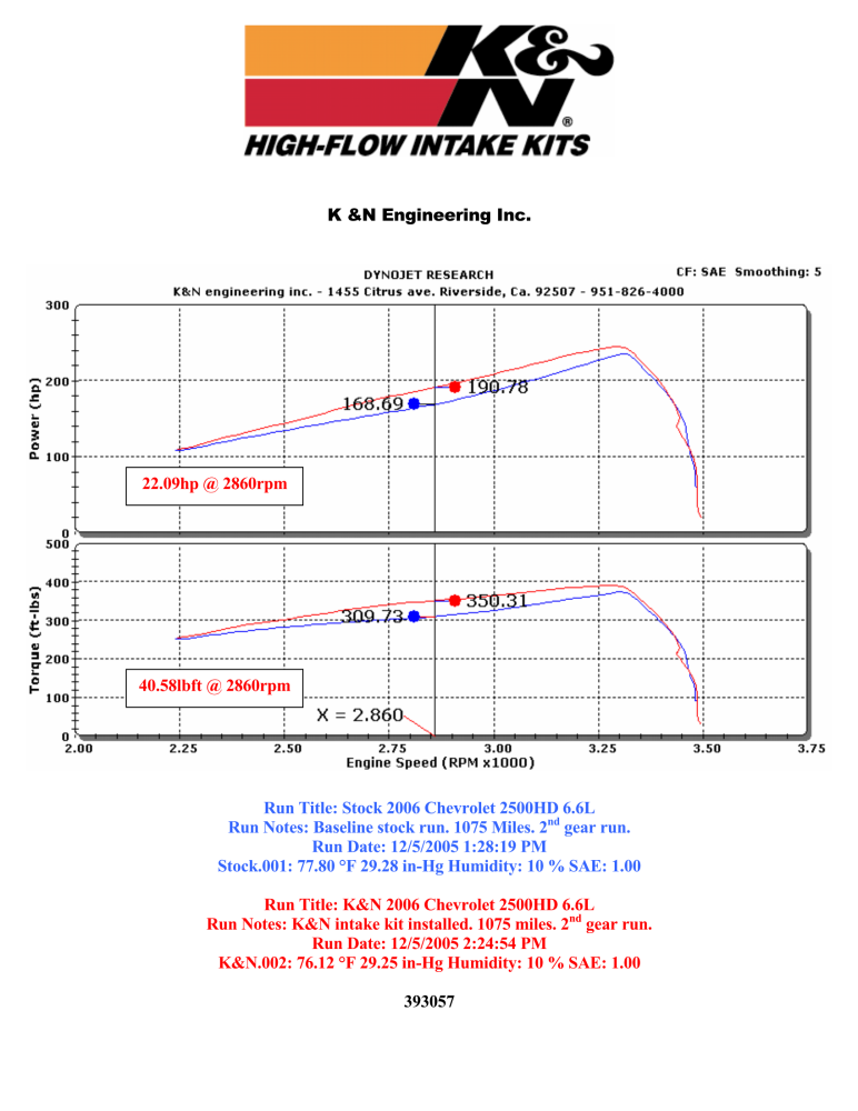 Ved at benytte et system med K&N Typhoon luftindtag fjernes de værste kilder til begrænsning af luftgennemstrømningen. K&N garanterer at du kan opnå højere motorydelse ved at erstatte de restriktive luftindtag som din bil er udstyret med fra fabrikken. K&N Sportluftfilter 57-3057 er testet med dynamometer for at bestemme den anslåede gevinst i hestekræfter.