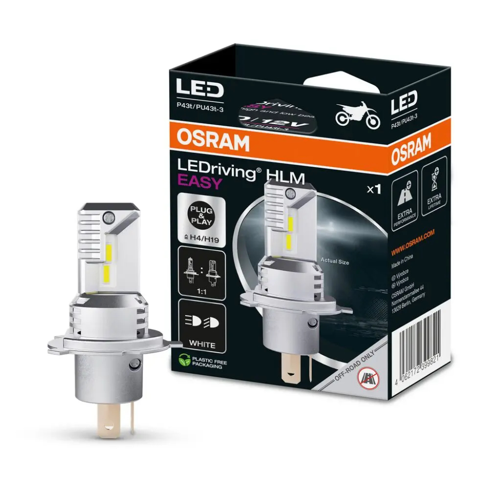 OSRAM LEDriving HLM EASY H4/H19 er et ultrakompakt LED-opgraderingssæt designet til motorcykler med traditionel H4- eller H19-forlygte. Med køligt hvidt lys på 6500 K giver pærerne både et moderne udtryk og en kraftig lysstyrke til forbedret synlighed.