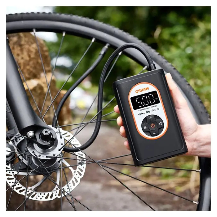OSRAM TYREinflate 4000 er en kompakt, ledningsfri og genopladelig dækpumpe med et kraftfuldt Li-Ion batteri, perfekt til camping, roadtrips og hverdagsbrug. Den er alsidig og kan bruges til biler, cykler, motorcykler, bolde og andre genstande, der kræver trykluft.
