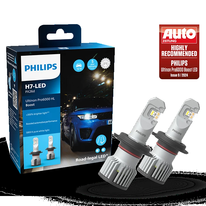 Philips H7 12V 20W Ultinon Pro6000 Boost 5800K** er en LED-bilpære designet til at forbedre bilens belysning. Her er nogle af de vigtigste funktioner og specifikationer ved denne model: