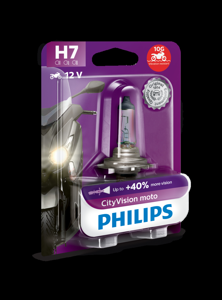 Specifikationer Designet til brug i bytrafikken Philips CityVision Moto-lyskilder er specifikt designet til at øge motorcyklistens sikkerhed i bytrafikken. Den opsigtsvækkende orange effekt samt en forøgelse af lysstyrken på 40 % giver motorcyklisten mere tryghed i trafikken og er aktivt med til at reducere antallet af ulykker.