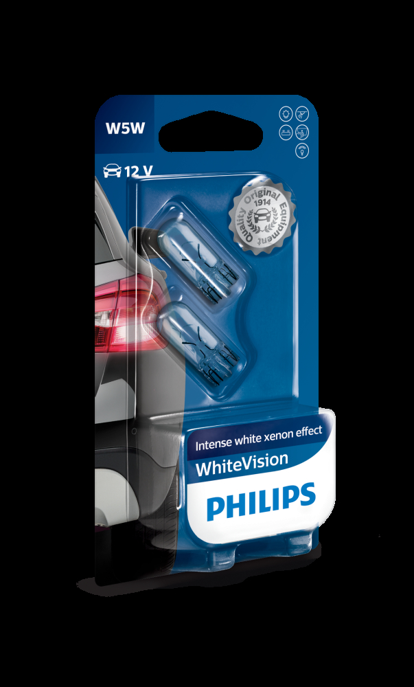 Philips WhiteVision-lyskilder tilføjer et intenst, hvidt xenon-look til din bils forlygter, så du får en førsteklasses køreoplevelse om natten. Den øgede lysstyrke med 40 % hvidere lys gør WhiteVision til en perfekt kombination af stil og sikkerhed.