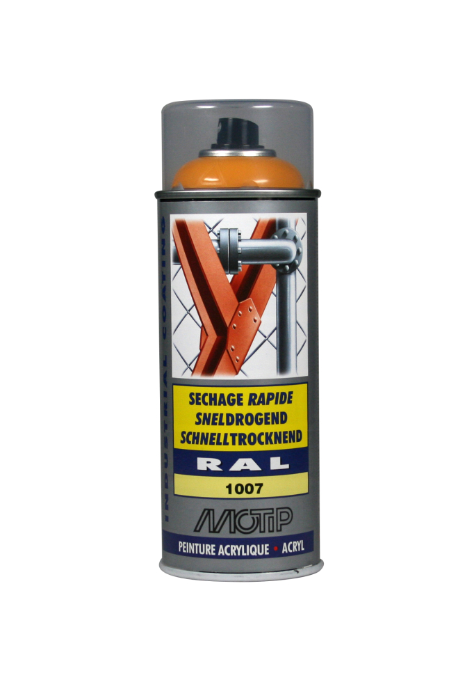 Hæfter på næsten alle overflader. Kendetegnes ved det specielle RAL farvekodesystem.Motip højglans Industri RAL 1007 farve er acrylbaseret kvalitets-spraymaling - og kan anvendes til mange formål. Industri RAL farver er meget hurtigtørrende og hærder efter blot 2 timer. Motip Højglans industrilak hærder til en ensartet og hård overflade. Spraymalingen kan bruges til de fleste malingsopgaver i hjemmet, garagen og industrien. Industri RAL spraymaling kan benyttes på både behandlede og ubehandlede overflader som bl.a. træ, metal, sten, glas, plast og kunststof.