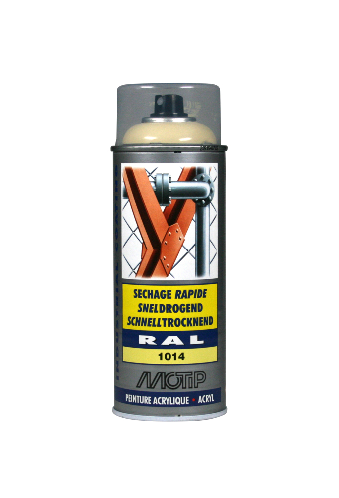 Hæfter på næsten alle overflader. Kendetegnes ved det specielle RAL farvekodesystem.Motip højglans Industri RAL 1014 farve er acrylbaseret kvalitets-spraymaling - og kan anvendes til mange formål. Industri RAL farver er meget hurtigtørrende og hærder efter blot 2 timer. Motip Højglans industrilak hærder til en ensartet og hård overflade. Spraymalingen kan bruges til de fleste malingsopgaver i hjemmet, garagen og industrien. Industri RAL spraymaling kan benyttes på både behandlede og ubehandlede overflader som bl.a. træ, metal, sten, glas, plast og kunststof.