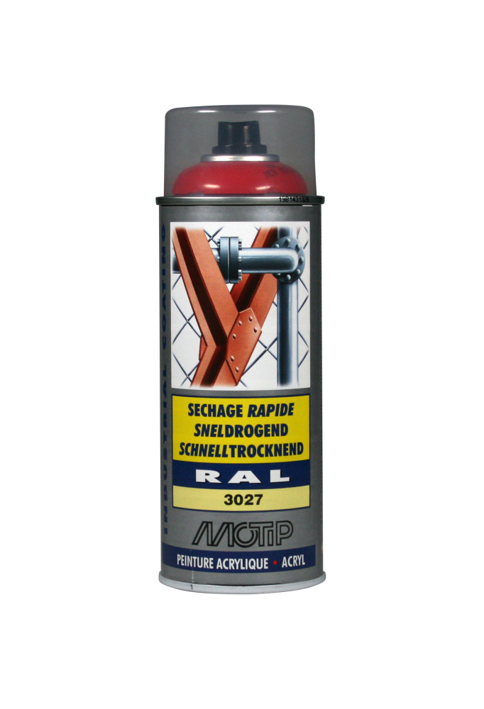 Hæfter på næsten alle overflader. Kendetegnes ved det specielle RAL farvekodesystem.Motip højglans Industri RAL 3027 farve er acrylbaseret kvalitets-spraymaling - og kan anvendes til mange formål. Industri RAL farver er meget hurtigtørrende og hærder efter blot 2 timer. Motip Højglans industrilak hærder til en ensartet og hård overflade. Spraymalingen kan bruges til de fleste malingsopgaver i hjemmet, garagen og industrien. Industri RAL spraymaling kan benyttes på både behandlede og ubehandlede overflader som bl.a. træ, metal, sten, glas, plast og kunststof.