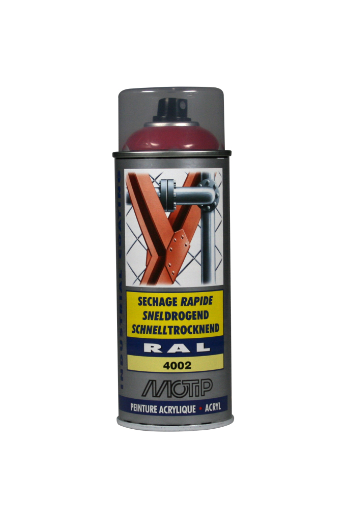 Hæfter på næsten alle overflader. Kendetegnes ved det specielle RAL farvekodesystem.Motip højglans Industri RAL 4002 farve er acrylbaseret kvalitets-spraymaling - og kan anvendes til mange formål. Industri RAL farver er meget hurtigtørrende og hærder efter blot 2 timer. Motip Højglans industrilak hærder til en ensartet og hård overflade. Spraymalingen kan bruges til de fleste malingsopgaver i hjemmet, garagen og industrien. Industri RAL spraymaling kan benyttes på både behandlede og ubehandlede overflader som bl.a. træ, metal, sten, glas, plast og kunststof.