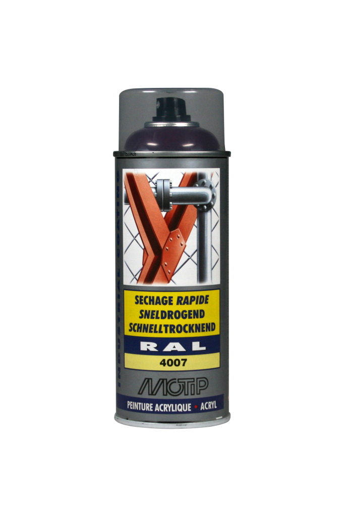 Hæfter på næsten alle overflader. Kendetegnes ved det specielle RAL farvekodesystem.Motip højglans Industri RAL 4007 farve er acrylbaseret kvalitets-spraymaling - og kan anvendes til mange formål. Industri RAL farver er meget hurtigtørrende og hærder efter blot 2 timer. Motip Højglans industrilak hærder til en ensartet og hård overflade. Spraymalingen kan bruges til de fleste malingsopgaver i hjemmet, garagen og industrien. Industri RAL spraymaling kan benyttes på både behandlede og ubehandlede overflader som bl.a. træ, metal, sten, glas, plast og kunststof.