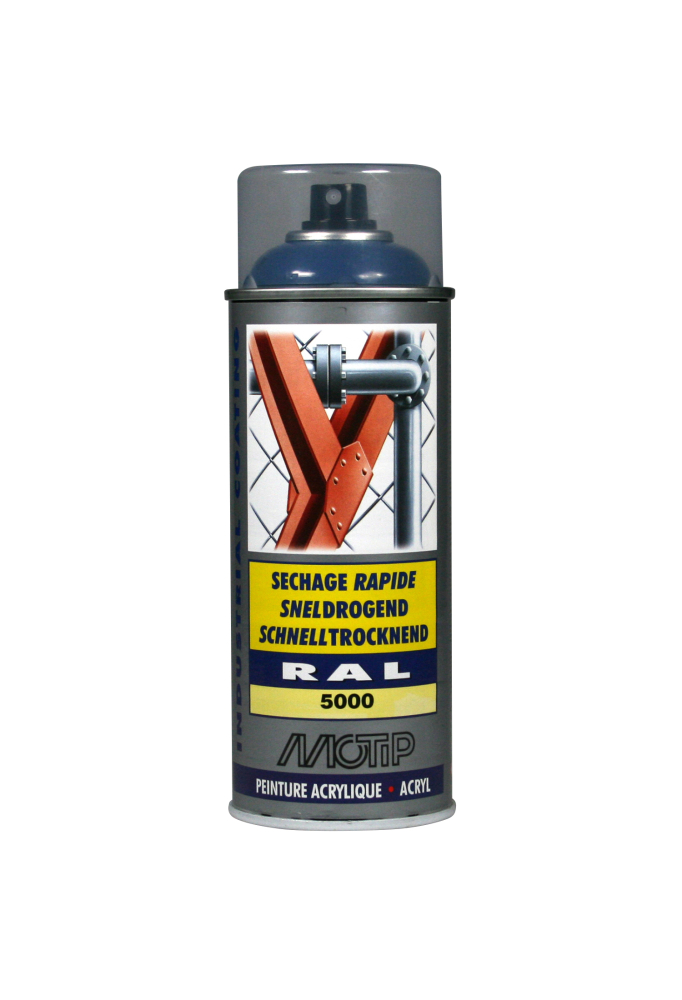 Hæfter på næsten alle overflader. Kendetegnes ved det specielle RAL farvekodesystem.Motip højglans Industri RAL 5000 farve er acrylbaseret kvalitets-spraymaling - og kan anvendes til mange formål. Industri RAL farver er meget hurtigtørrende og hærder efter blot 2 timer. Motip Højglans industrilak hærder til en ensartet og hård overflade. Spraymalingen kan bruges til de fleste malingsopgaver i hjemmet, garagen og industrien. Industri RAL spraymaling kan benyttes på både behandlede og ubehandlede overflader som bl.a. træ, metal, sten, glas, plast og kunststof.