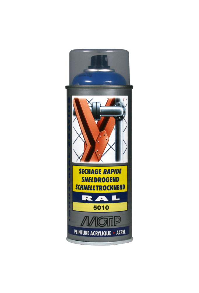 Hæfter på næsten alle overflader. Kendetegnes ved det specielle RAL farvekodesystem.Motip højglans Industri RAL 5010 farve er acrylbaseret kvalitets-spraymaling - og kan anvendes til mange formål. Industri RAL farver er meget hurtigtørrende og hærder efter blot 2 timer. Motip Højglans industrilak hærder til en ensartet og hård overflade. Spraymalingen kan bruges til de fleste malingsopgaver i hjemmet, garagen og industrien. Industri RAL spraymaling kan benyttes på både behandlede og ubehandlede overflader som bl.a. træ, metal, sten, glas, plast og kunststof.