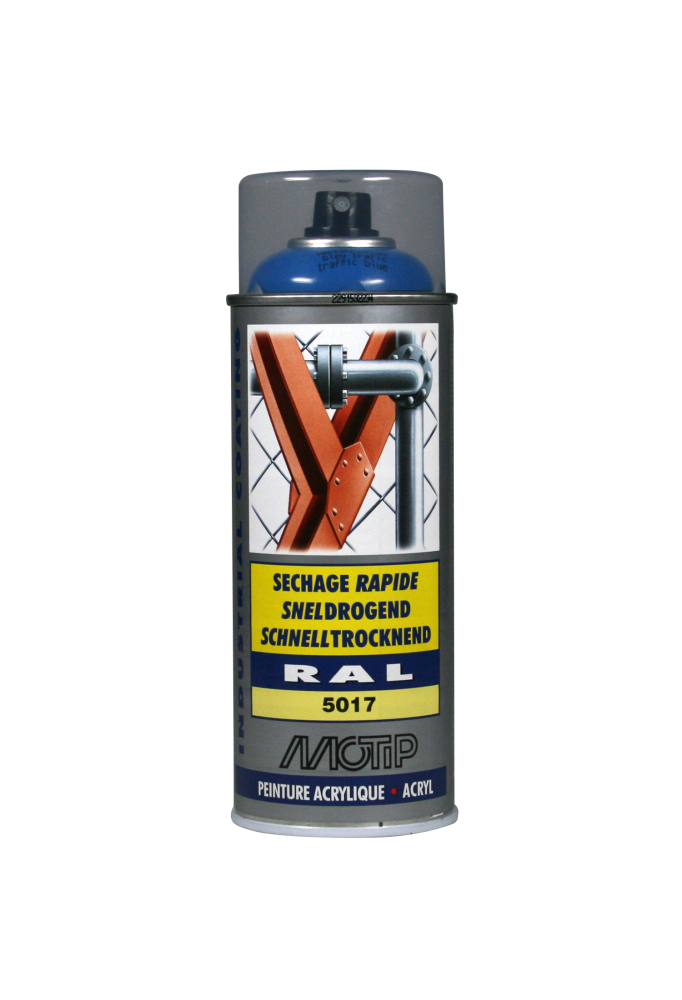 Hæfter på næsten alle overflader. Kendetegnes ved det specielle RAL farvekodesystem.Motip højglans Industri RAL 5017 farve er acrylbaseret kvalitets-spraymaling - og kan anvendes til mange formål. Industri RAL farver er meget hurtigtørrende og hærder efter blot 2 timer. Motip Højglans industrilak hærder til en ensartet og hård overflade. Spraymalingen kan bruges til de fleste malingsopgaver i hjemmet, garagen og industrien. Industri RAL spraymaling kan benyttes på både behandlede og ubehandlede overflader som bl.a. træ, metal, sten, glas, plast og kunststof.
