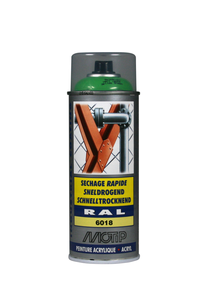 Hæfter på næsten alle overflader. Kendetegnes ved det specielle RAL farvekodesystem.Motip højglans Industri RAL 6018 farve er acrylbaseret kvalitets-spraymaling - og kan anvendes til mange formål. Industri RAL farver er meget hurtigtørrende og hærder efter blot 2 timer. Motip Højglans industrilak hærder til en ensartet og hård overflade. Spraymalingen kan bruges til de fleste malingsopgaver i hjemmet, garagen og industrien. Industri RAL spraymaling kan benyttes på både behandlede og ubehandlede overflader som bl.a. træ, metal, sten, glas, plast og kunststof.