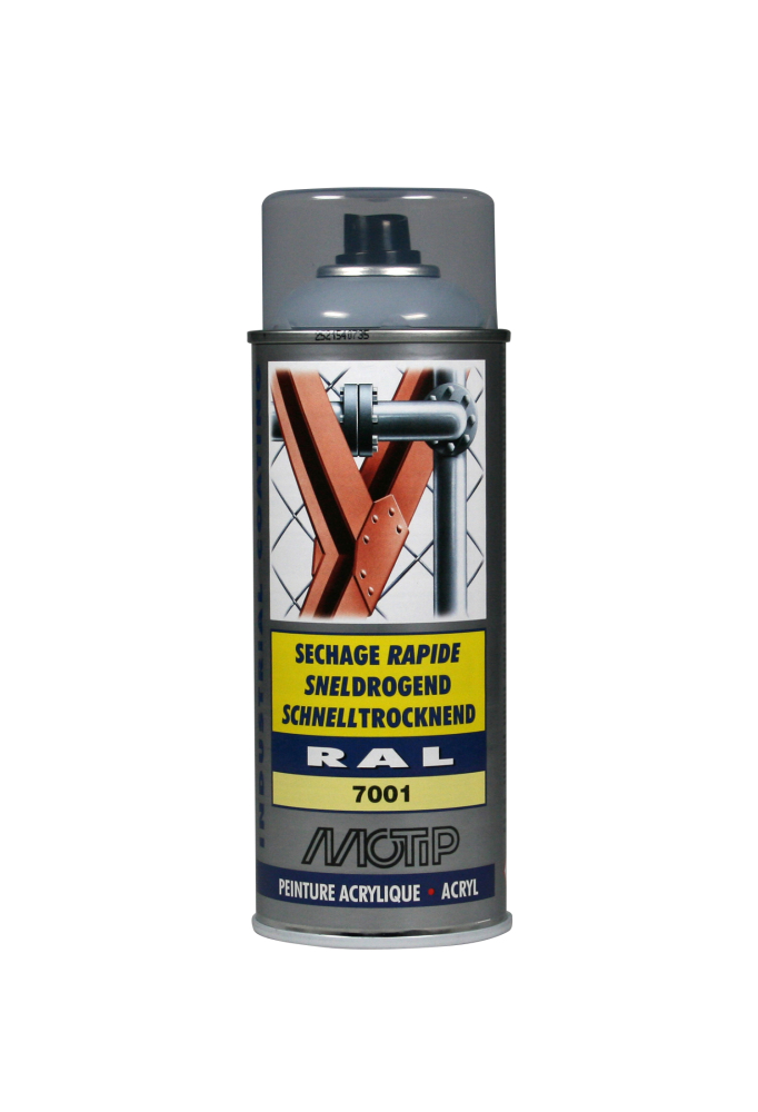 Hæfter på næsten alle overflader. Kendetegnes ved det specielle RAL farvekodesystem.Motip højglans Industri RAL 7001 farve er acrylbaseret kvalitets-spraymaling - og kan anvendes til mange formål. Industri RAL farver er meget hurtigtørrende og hærder efter blot 2 timer. Motip Højglans industrilak hærder til en ensartet og hård overflade. Spraymalingen kan bruges til de fleste malingsopgaver i hjemmet, garagen og industrien. Industri RAL spraymaling kan benyttes på både behandlede og ubehandlede overflader som bl.a. træ, metal, sten, glas, plast og kunststof.