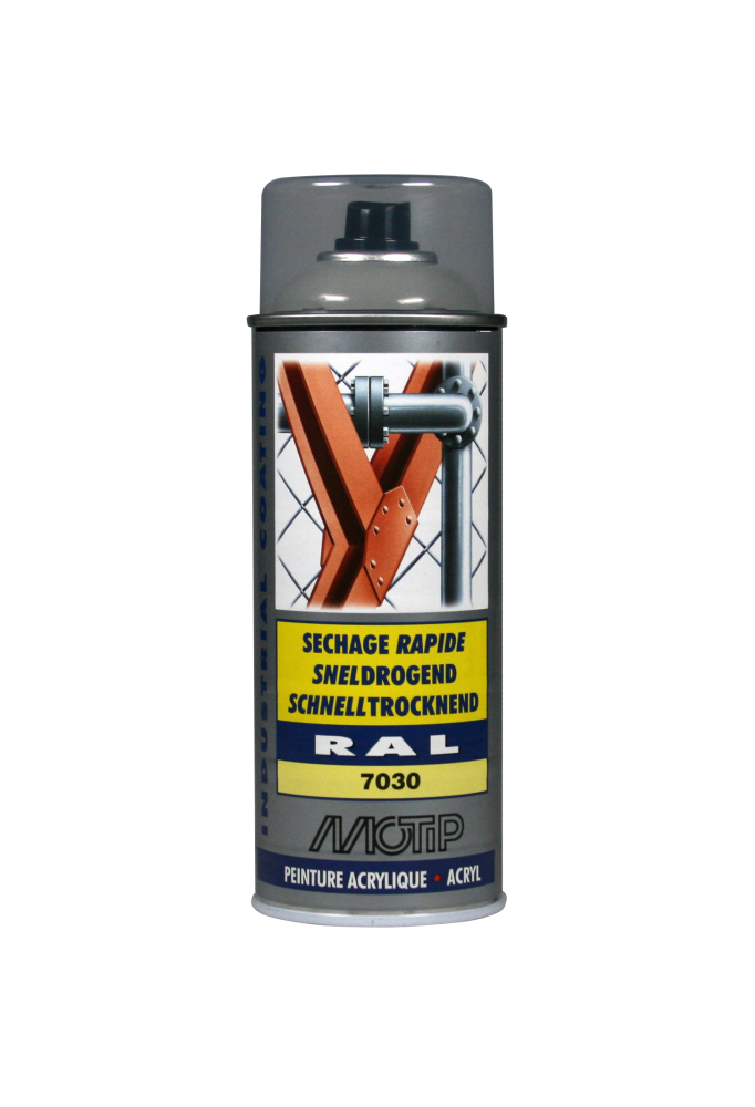 Hæfter på næsten alle overflader. Kendetegnes ved det specielle RAL farvekodesystem.Motip højglans Industri RAL 7030 farve er acrylbaseret kvalitets-spraymaling - og kan anvendes til mange formål. Industri RAL farver er meget hurtigtørrende og hærder efter blot 2 timer. Motip Højglans industrilak hærder til en ensartet og hård overflade. Spraymalingen kan bruges til de fleste malingsopgaver i hjemmet, garagen og industrien. Industri RAL spraymaling kan benyttes på både behandlede og ubehandlede overflader som bl.a. træ, metal, sten, glas, plast og kunststof.