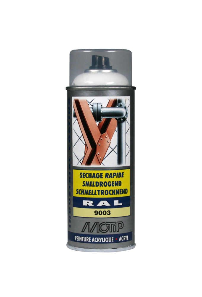 Hæfter på næsten alle overflader. Kendetegnes ved det specielle RAL farvekodesystem.Motip højglans Industri RAL 9003 farve er acrylbaseret kvalitets-spraymaling - og kan anvendes til mange formål. Industri RAL farver er meget hurtigtørrende og hærder efter blot 2 timer. Motip Højglans industrilak hærder til en ensartet og hård overflade. Spraymalingen kan bruges til de fleste malingsopgaver i hjemmet, garagen og industrien. Industri RAL spraymaling kan benyttes på både behandlede og ubehandlede overflader som bl.a. træ, metal, sten, glas, plast og kunststof.