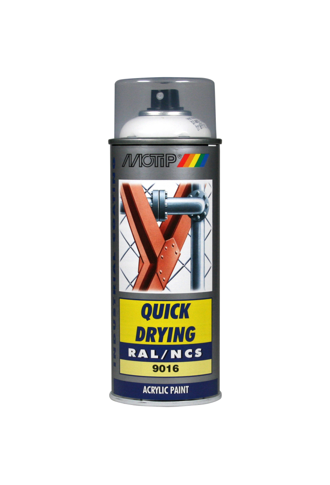 Hæfter på næsten alle overflader. Kendetegnes ved det specielle RAL farvekodesystem.Motip højglans Industri RAL 9016 farve er acrylbaseret kvalitets-spraymaling - og kan anvendes til mange formål. Industri RAL farver er meget hurtigtørrende og hærder efter blot 2 timer. Motip Højglans industrilak hærder til en ensartet og hård overflade. Spraymalingen kan bruges til de fleste malingsopgaver i hjemmet, garagen og industrien. Industri RAL spraymaling kan benyttes på både behandlede og ubehandlede overflader som bl.a. træ, metal, sten, glas, plast og kunststof.