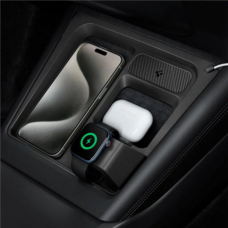 Opgrader din Tesla med denne elegante og funktionelle 3-i-1 trådløse opladerstation – skræddersyet til Model 3 Highland (2024). Med præcise udskæringer giver den nem adgang til både mobiltelefon og AirPods, og den er designet til nem indsættelse af Apple Watch-oplader (oplader medfølger ikke).