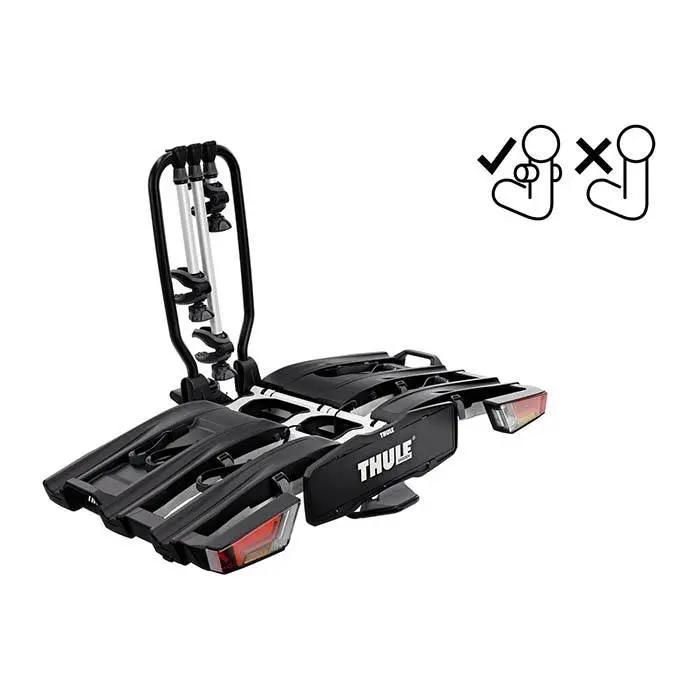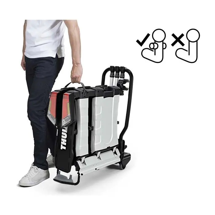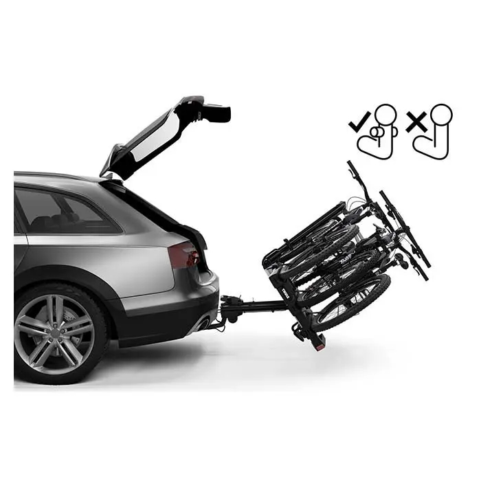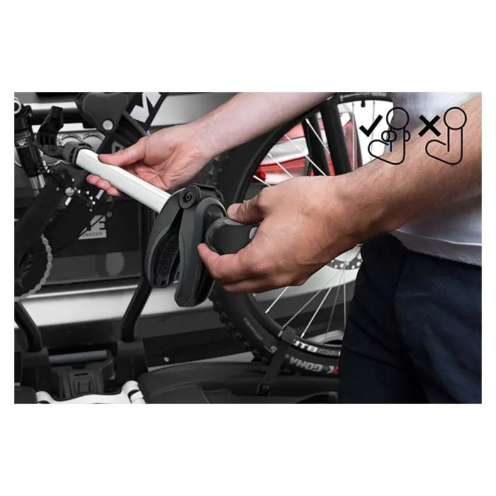 Cykelholderen er udstyret med aftagelige cykelarme med Thule AcuTight-greb, der klikker, når det korrekte moment er nået, hvilket sikrer en sikker og nem fastgørelse af cyklerne. Den smarte vippefunktion med fodpedal gør det nemt at få adgang til bilens bagagerum – selv når cyklerne er monteret.