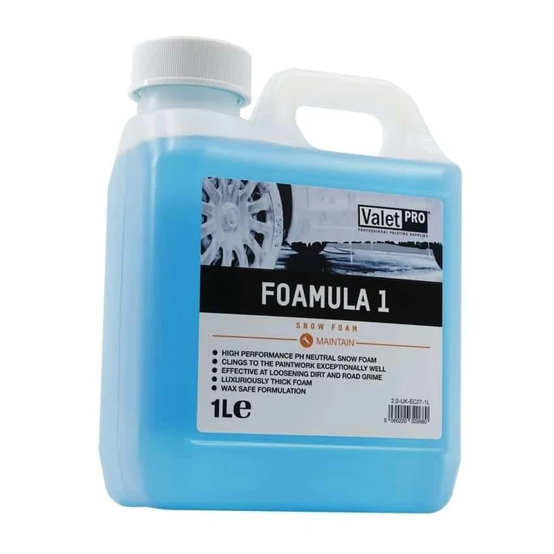 Valet Pro Foamula 1 er en højeffektiv og pH-neutral skumforvask, der skånsomt løsner snavs, vejfilm og andre urenheder fra bilens overflade. Den tykke skum sikrer en længere kontakttid, hvilket forbedrer rengøringseffekten og minimerer behovet for berøring, så risikoen for vaskeridser reduceres.