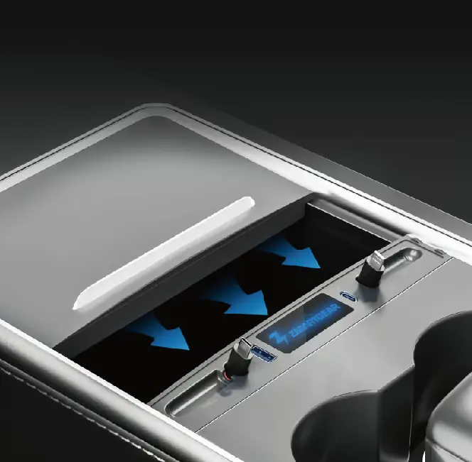 Optimer din Tesla-oplevelse med denne elegante og effektive opladningshub, skræddersyet til midterkonsollen i Tesla Model Y og Model 3 (årgang 2021–2023). Hubben tilsluttes nemt via de to medfølgende korte USB-C kabler, som passer perfekt til bilens originale stik.